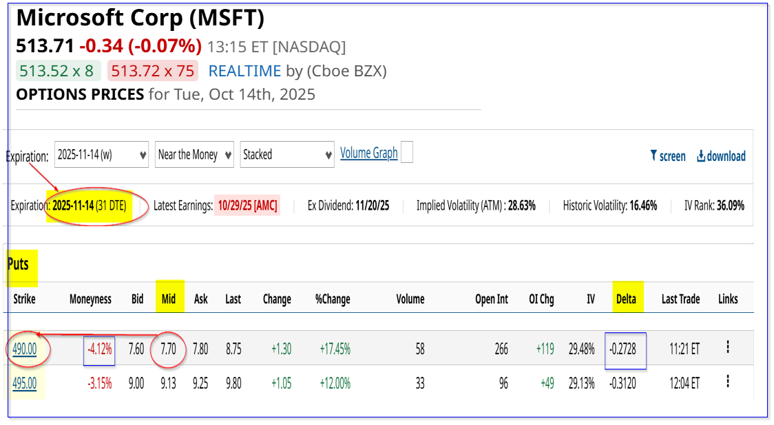 This play can now be repeated. For example, the Nov. 14, 2025, expiry put option expiry period shows that the $490 strike price put has a midpoint premium of $7.70. That provides an investor with an immediate yield of 1.57%: