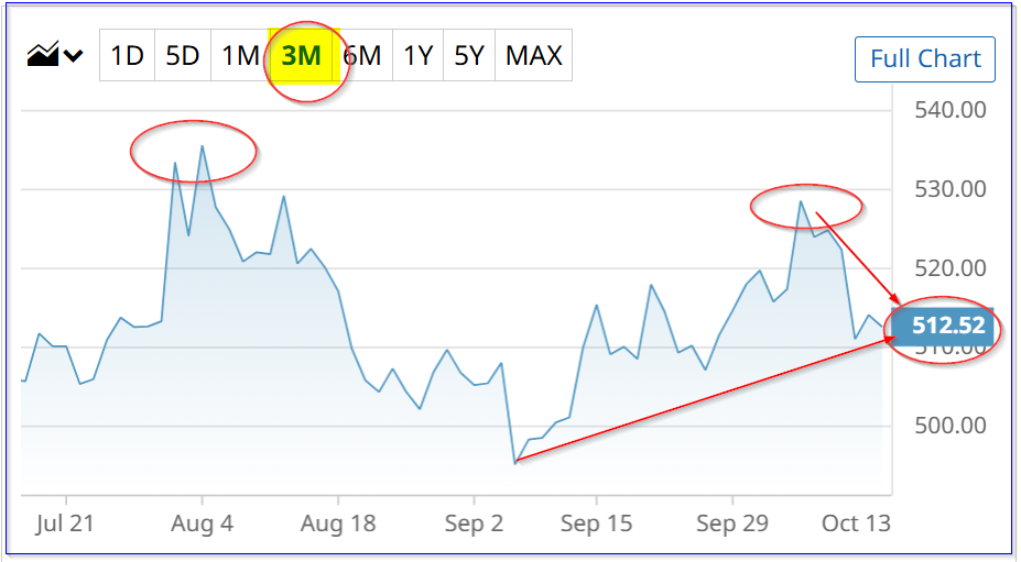 MSFT is at $513.55 in midday trading on Tuesday, Oct. 14, down slightly in a down market. It's off a recent peak of $535.64 on Aug. 4 and more recently $528.58 on Oct. 6.